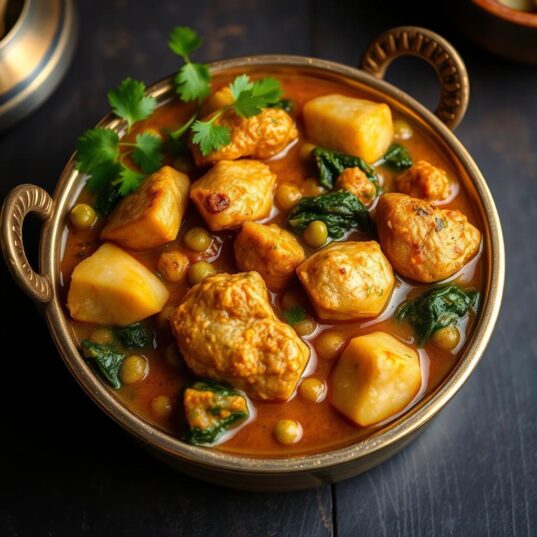 The tender chunks of chicken, the comforting presence of potatoes, and the burst of vibrant green peas come together in this delicious curry that promises to delight your taste buds!