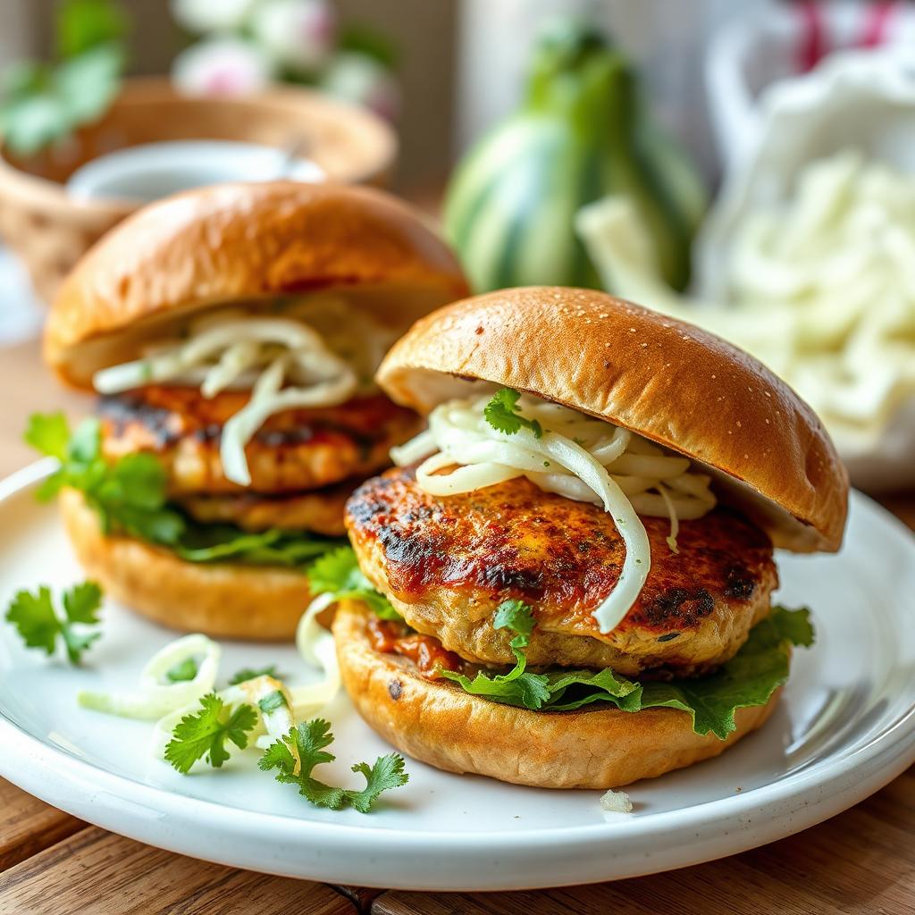 - Mix together all the ingredients for the chicken burgers. Make 6 patties and set aside in the fridge to marinade for 2 hours or overnight.