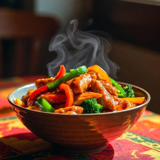 - Heat the oil in a wok or a pan over a medium to high heat. Then add the garlic and ginger and while continually tossing and stirring add in the chicken and cook until browned. Then add the vegetables and onion and stir-fry for two minutes.
