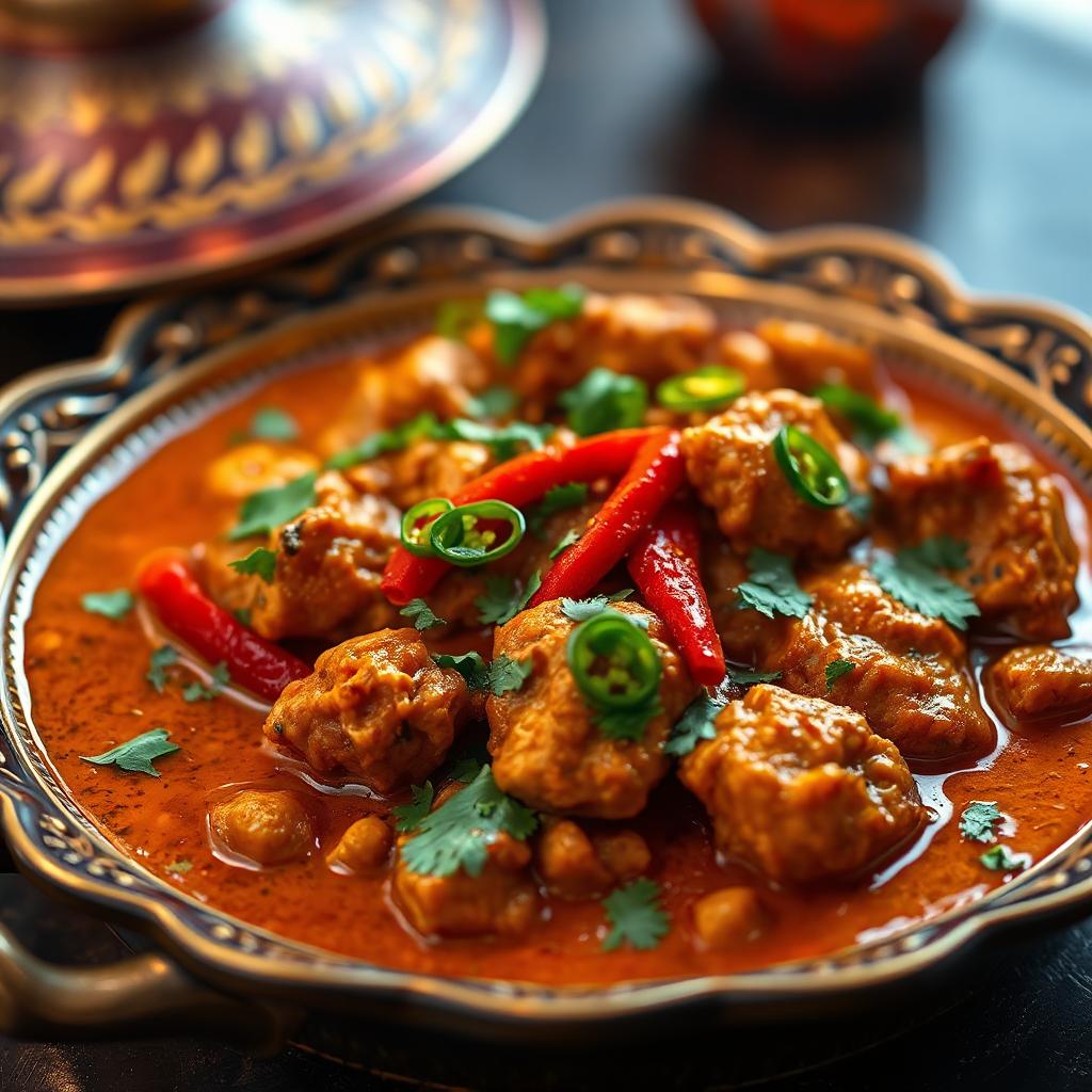 - Heat the oil in a medium sized pan and fry the marinated chicken stirring continuously. After a few minutes, turn down the heat and add the chopped onion, the red pepper and chillies. Stir this until the onions and pepper soften and the chicken is cooked.