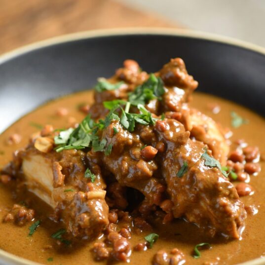 - Continue to simmer for 40 minutes stirring often. Check to see if the chicken is cooked all the way through. Turn off the heat, add the lime juice and check seasoning. Leave to rest for 10 minutes. Scatter over the sliced chilli, spring onions, fresh coriander and rest of the peanuts. Serve with Shemin’s Indian Breads