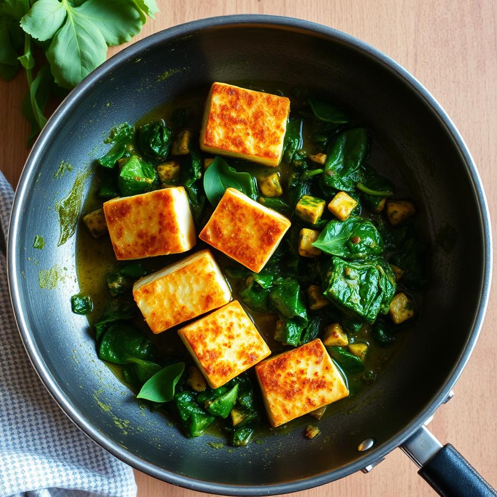 - Add enough cooking oil to cover the base of a large non stick (if possible) frying pan and place it over a medium heat. Fry the cubes of paneer until they are browned and crisp on all sides.