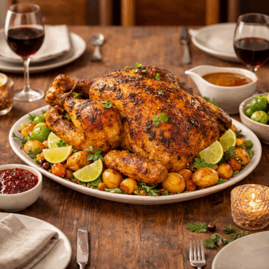 Rub the marinade generously all over the turkey, ensuring the legs, wings, and breast are well coated. Let it marinate in the fridge for at least 2 hours or overnight for maximum flavour. - Roast the Turkey: