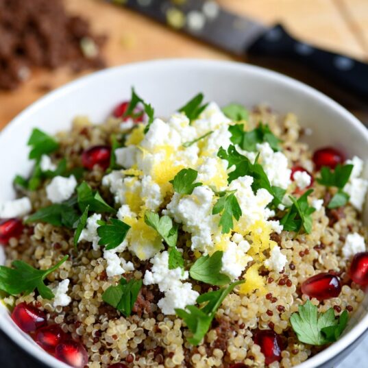 This recipe is bursting with fragrant spices, fresh herbs, spicy mince, and is topped with a delicious feta and quinoa crumble. Add the pop of fresh pomegranate and you’ve got yourself a showstopper!