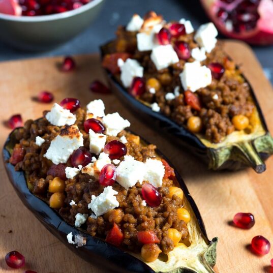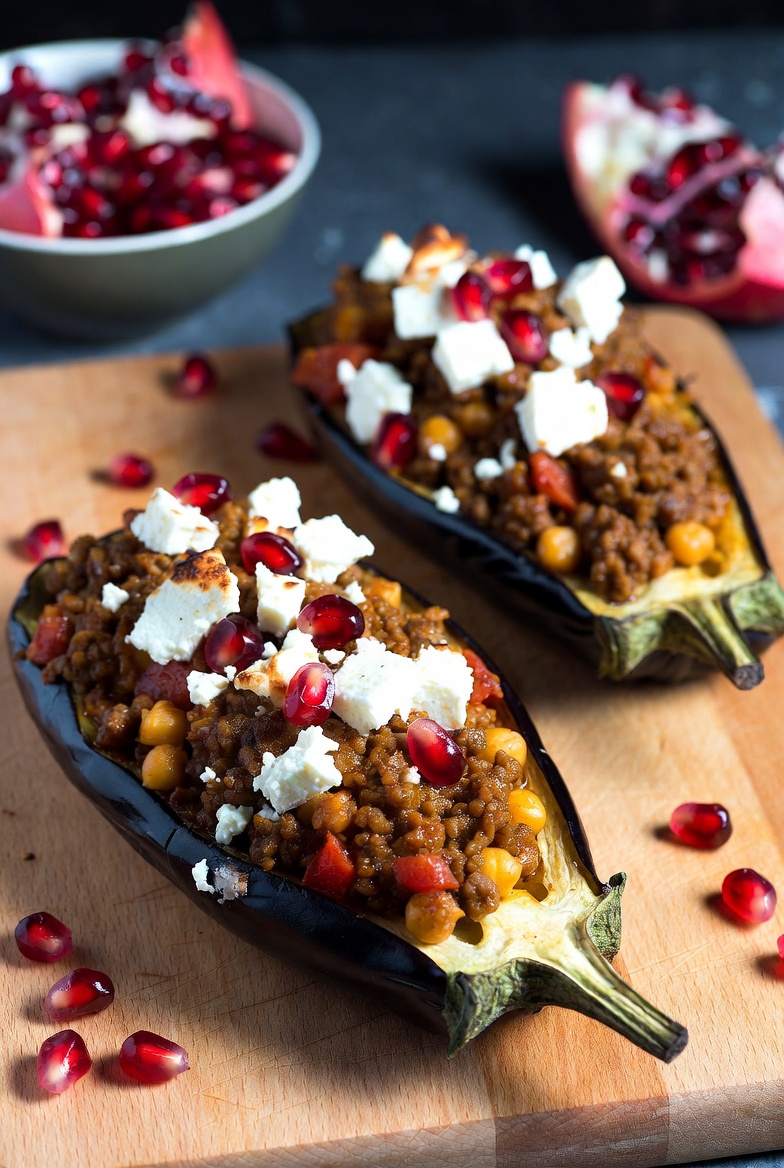 - Divide the mixture between the baked aubergine halves. Crumble the feta and sprinkle it over the aubergines, then return them to the oven for 40 to 45 minutes until the feta is slightly browned and aubergine skins are very soft.