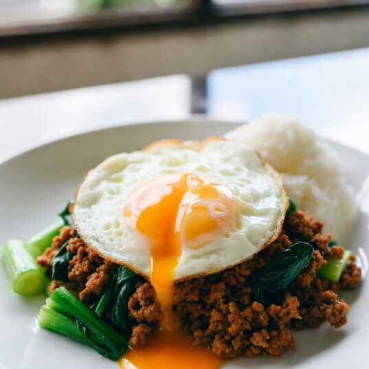 Pad Kra Pao is one of Thailand’s most beloved street food dishes. You’ll find it sizzling in roadside woks across Bangkok, often served with a crispy fried egg (kai dao) on top.