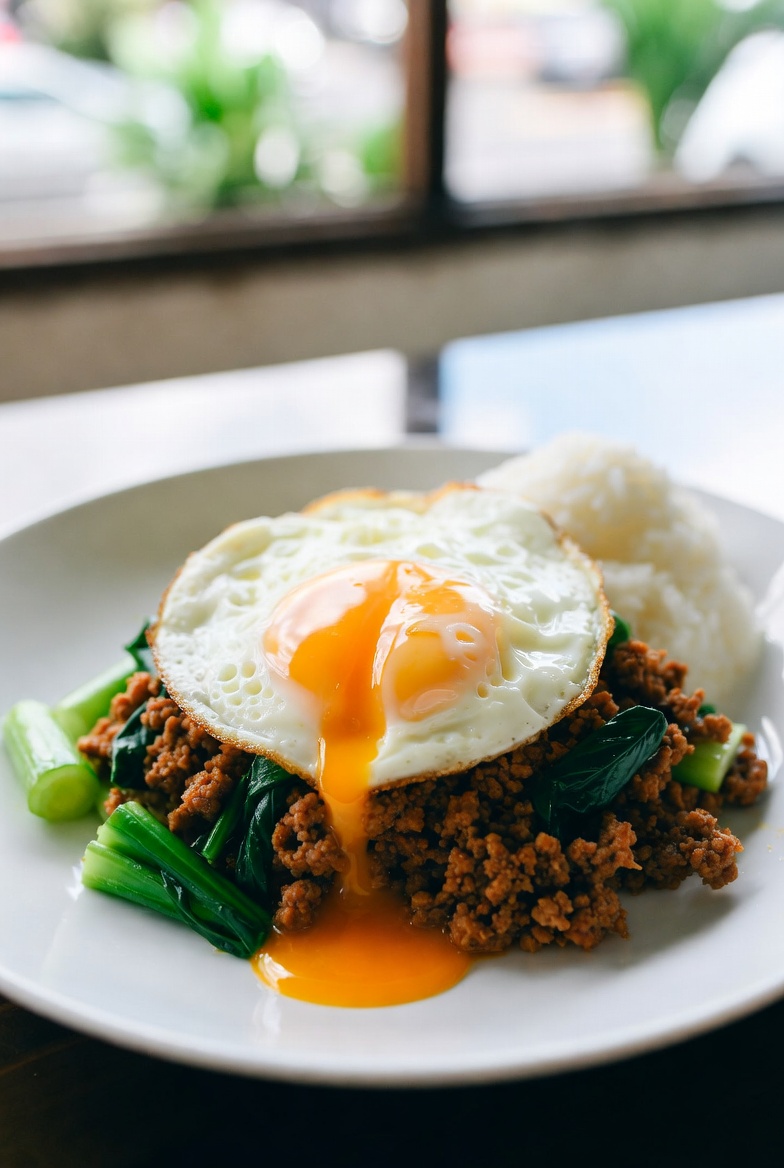 That runny yolk mixing into the spicy pork and basil? It’s magic.