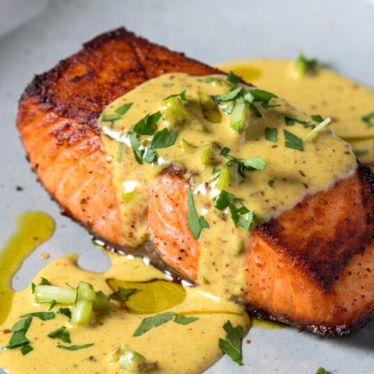 - In a large pan over a medium-high heat, heat the oil. When the oil is hot but not smoking, add the salmon skin-side down and cook the salmon for roughly 4-6 minutes. Once the colour change has moved up about three-quarters of the way from the bottom, it’s time to flip the salmon over and cook for 2-3 minutes flesh side down.