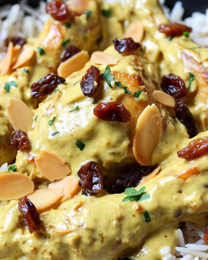 - If the sauce is too runny remove the lid, turn up the heat to reduce the sauce until it is thick and clings to the chicken. When ready to serve sprinkle the toasted almonds over the chicken.