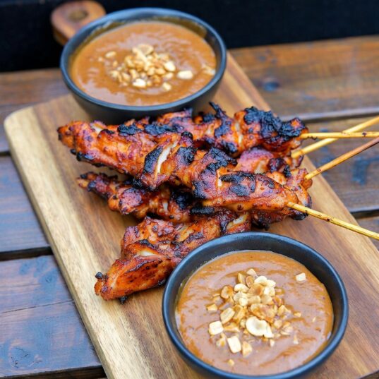- To make a dipping sauce to serve this with, fry 50g Shemin’s Indian Paste with 250g of peanut butter. When the peanut butter is melted, add double cream until the desired consistency is achieved.
