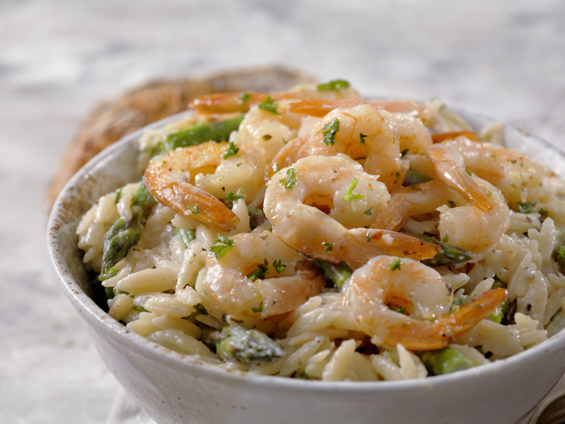 Home » Products » Thai Green Curry Paste » Shemin’s Thai Twist Prawn Risotto » Creamy Parmesan Orzo with Shrimp and Asparagus