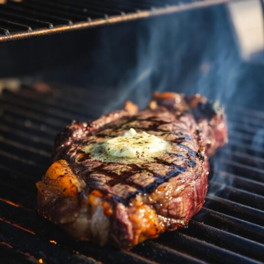 - When cooked, put on a plate and immediately top the steaks with half the Cajun butter for each steak. Cover loosely with foil allowing the butter to melt and the steaks to rest for a minute. Serve with the slaw and chips or a baked sweet potato.